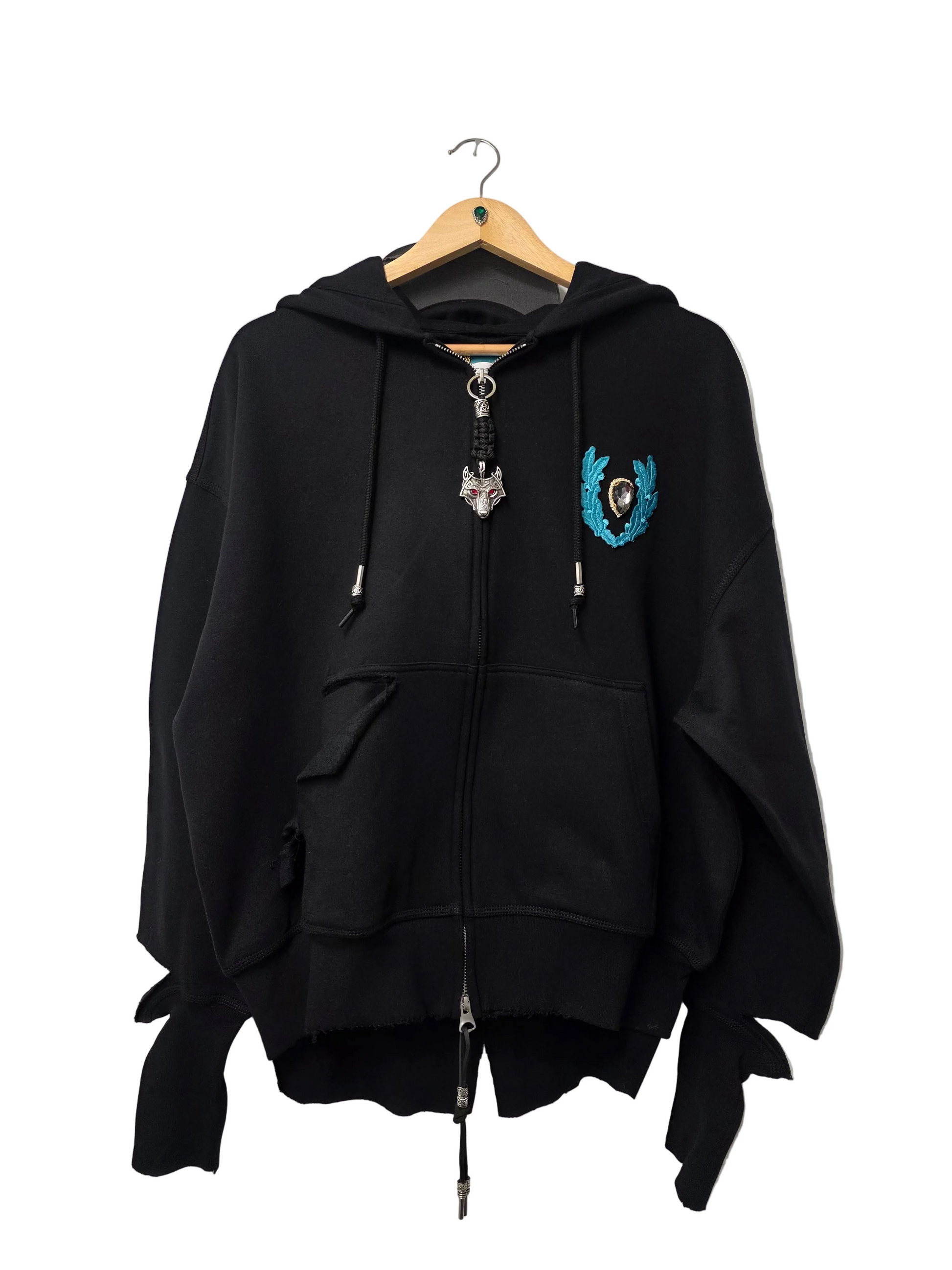 The design features a full-length metal zipper anchored by a custom paracord pull, finished with sculptural hardware that adds weight and ritualistic presence at the centerline. Extended drawstrings with metal tips reinforce the industrial tone while allowing adjustable styling.