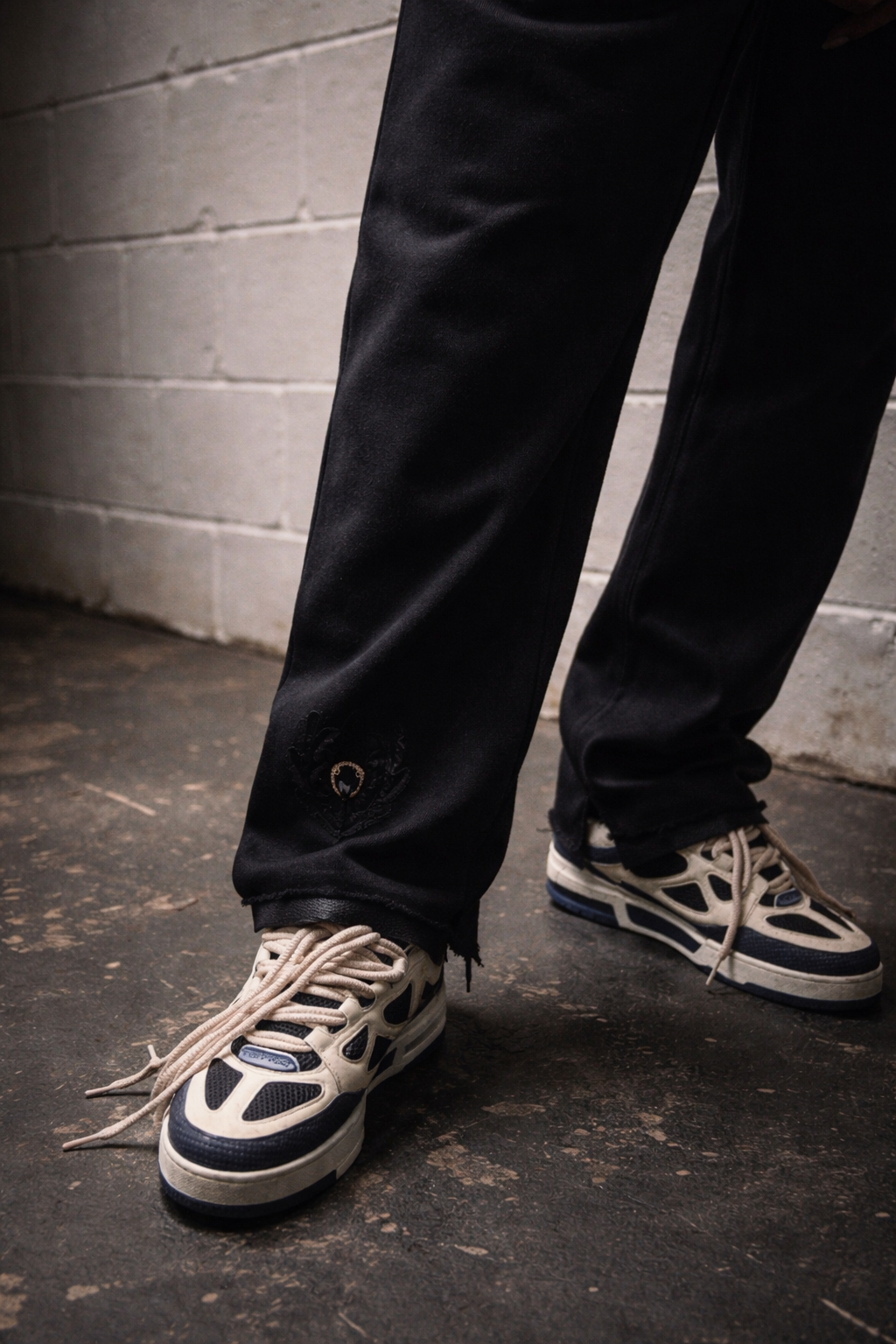 Minimalist side pockets preserve the clean profile, while a signature woven brand tag is placed with restraint, maintaining exclusivity rather than overt branding. At the lower leg, raw-cut distressed hems are left intentionally unfinished, giving the garment its worn-in, battle-tested edge.