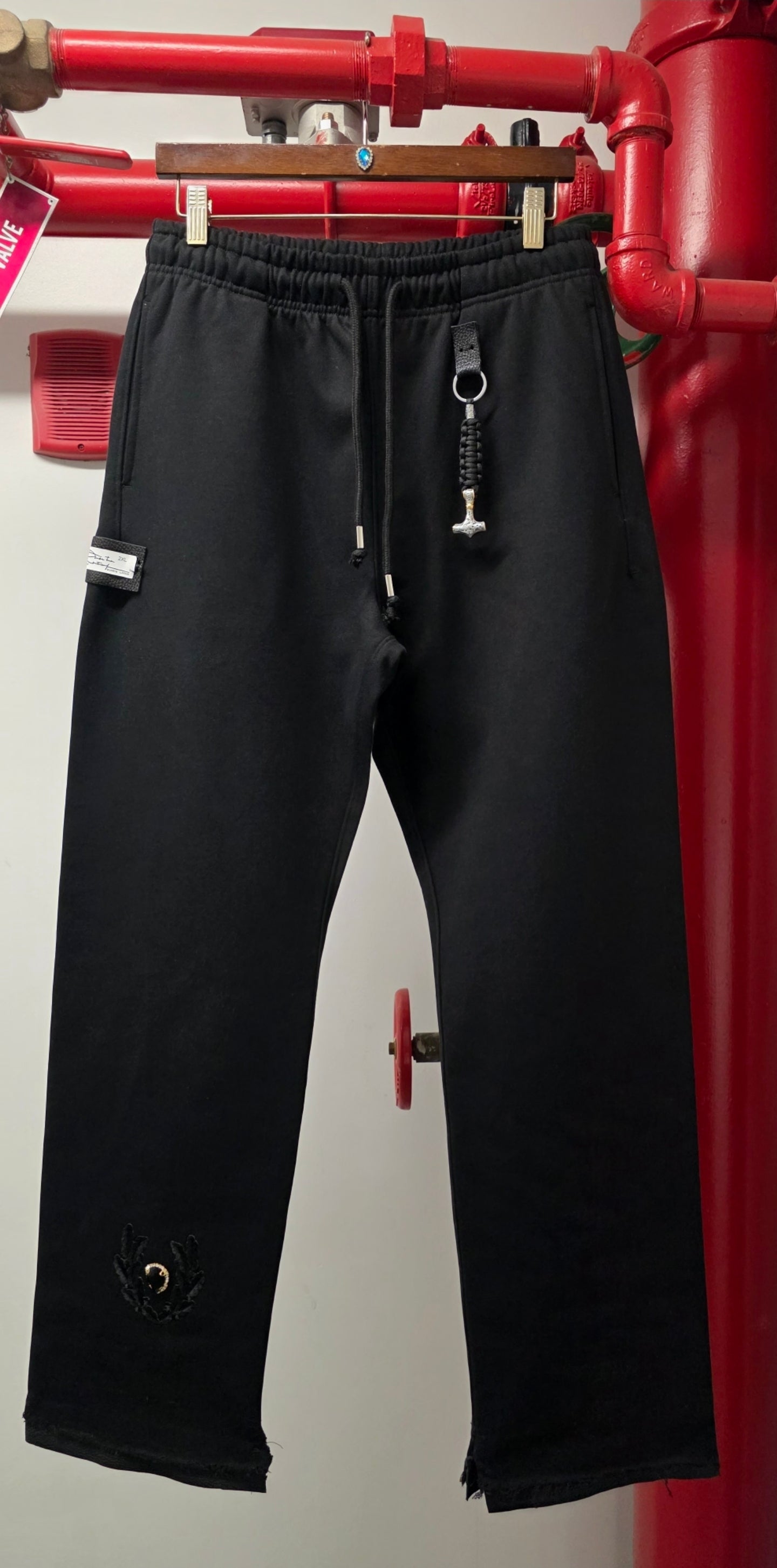 The waistband features a reinforced elastic construction with elongated drawstrings, designed to hang clean and add vertical balance to the form. Attached at the waist is a custom paracord utility link, finished with a polished stainless steel Mjolnir hammer charm—a symbolic nod to resilience, protection, and raw strength. The hardware is subtle yet unmistakable, moving naturally with the body.