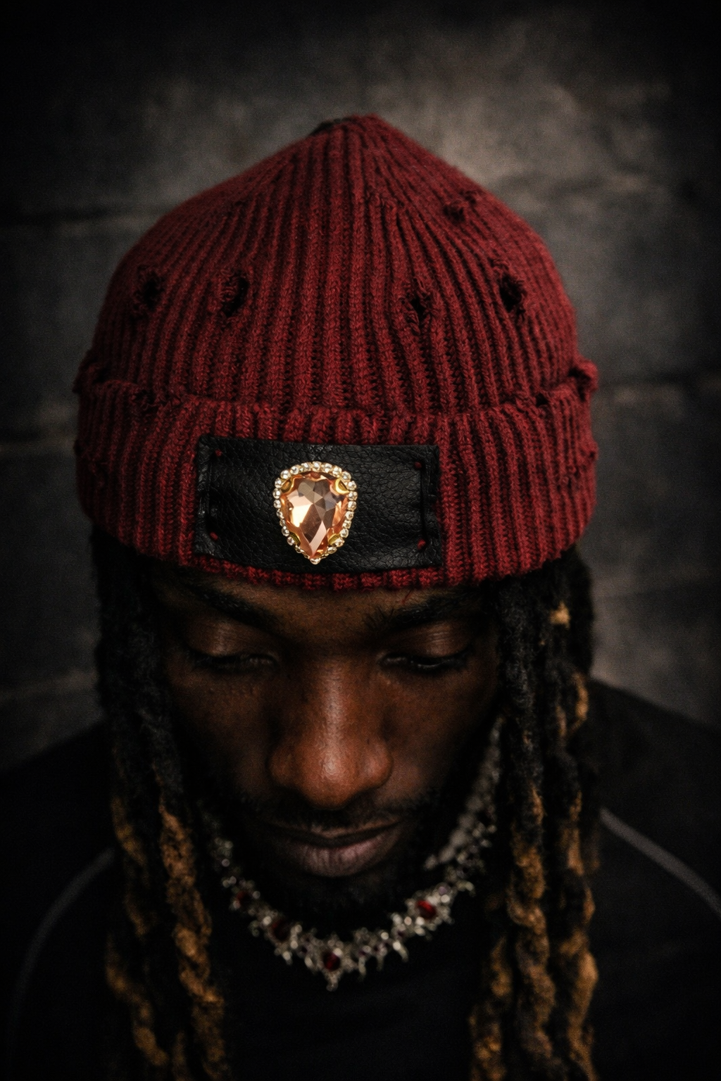 This piece is a statement of intention — raw, refined, and unapologetically bold. Crafted from premium cotton twill, the Distressed Jewel Crown Beanie merges rugged construction with luxury detailing. Each cap features intentional distressing throughout the crown, creating a worn-in character that feels lived, not manufactured.