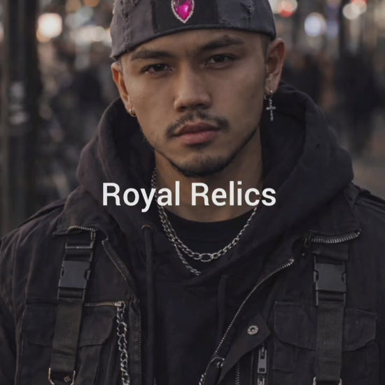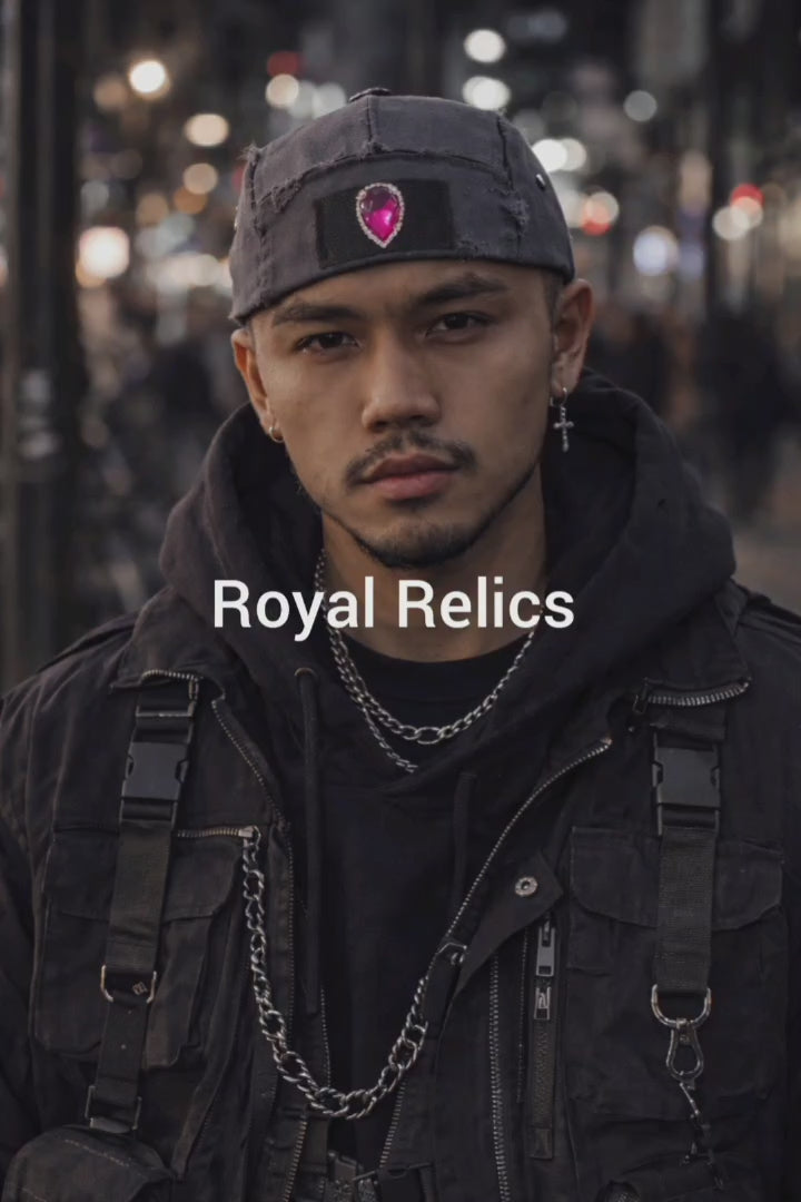 The Royal Relic Beanie is constructed as a structured multi-panel cap body without a traditional brim, creating a crown-like silhouette that sits close to the head rather than projecting outward. The geometry produces a sharper profile than a standard beanie while remaining soft-wearable.